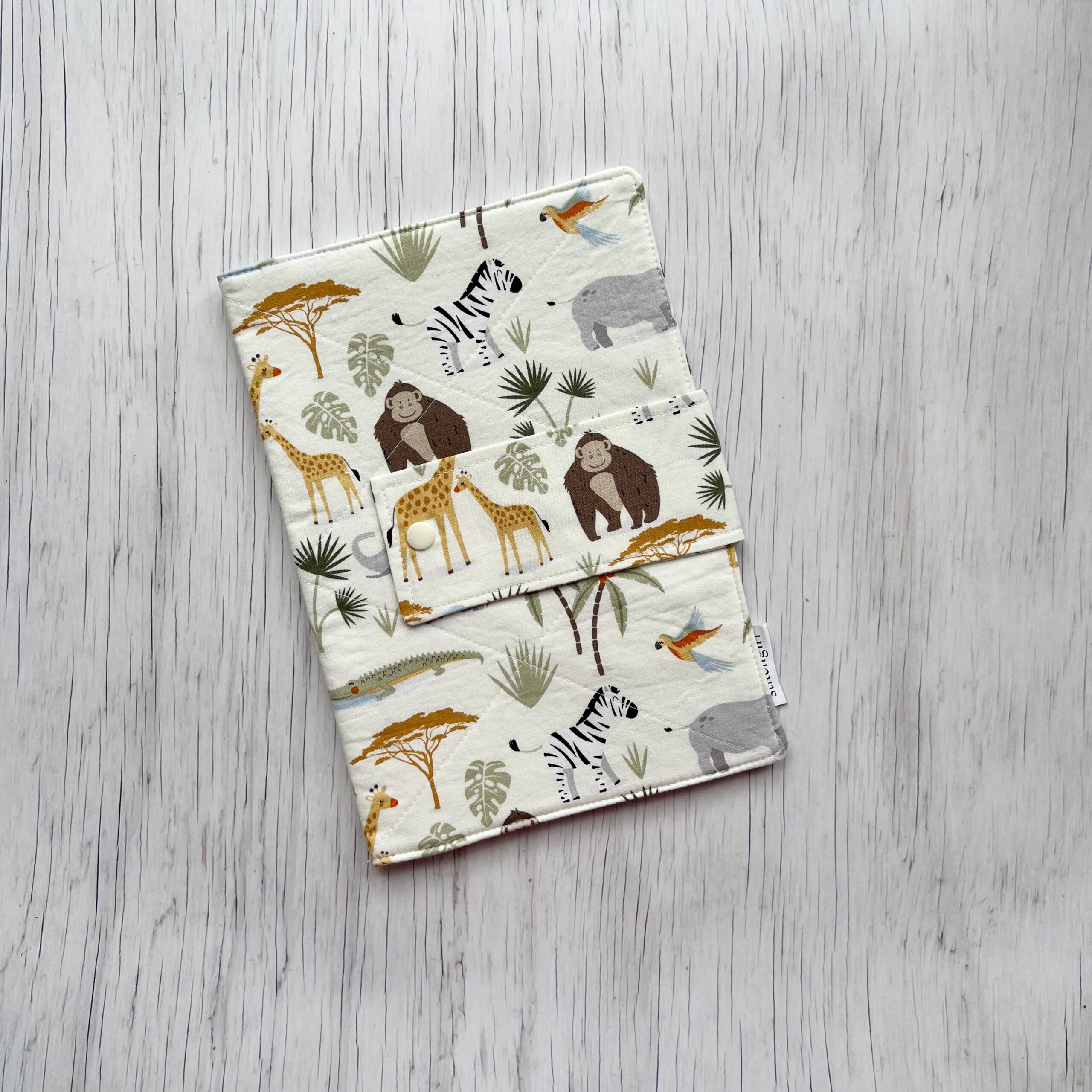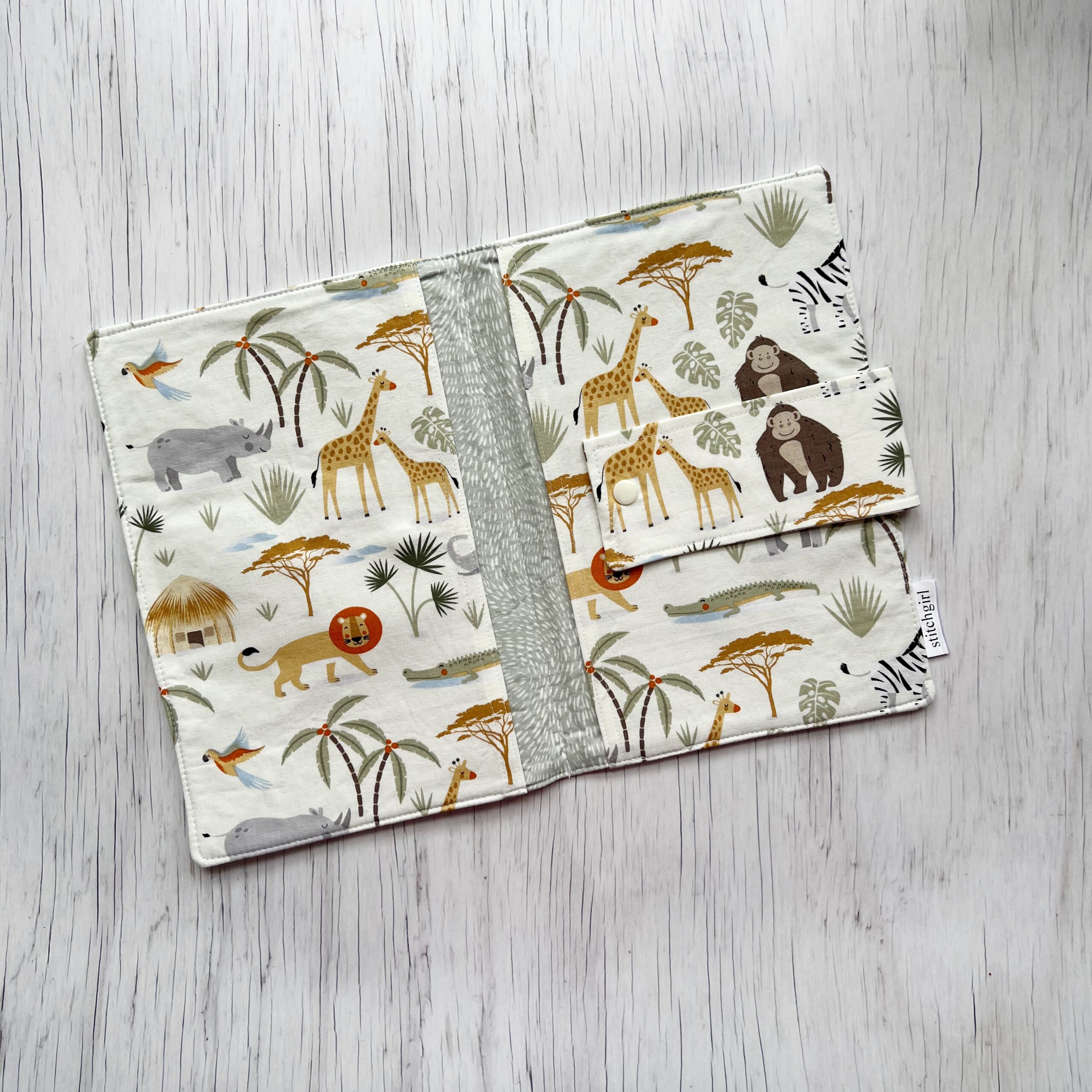 Made from 100% Cotton, with a fusible fleece which I quilt, 2 Snap Button positions to take a large pack of wipes, 2 internal pockets to slip some nappies & wipes.