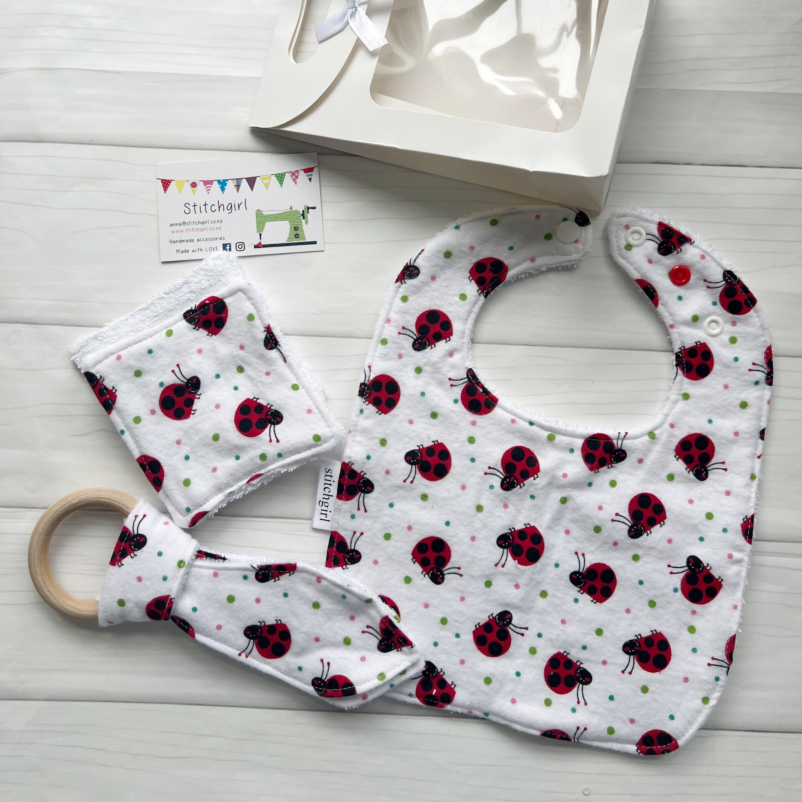 A perfect gift for someone wanting to give a wee present. Set comes as shown, consists of a small size Bib with 3 neck positions, 2 mini Cleansing Cloths & a Bunny Ear Teether